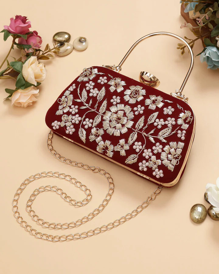 Embroidered Clutch | Handmade Velvet Maroon Clutch | Minimalist Embroidered Purse