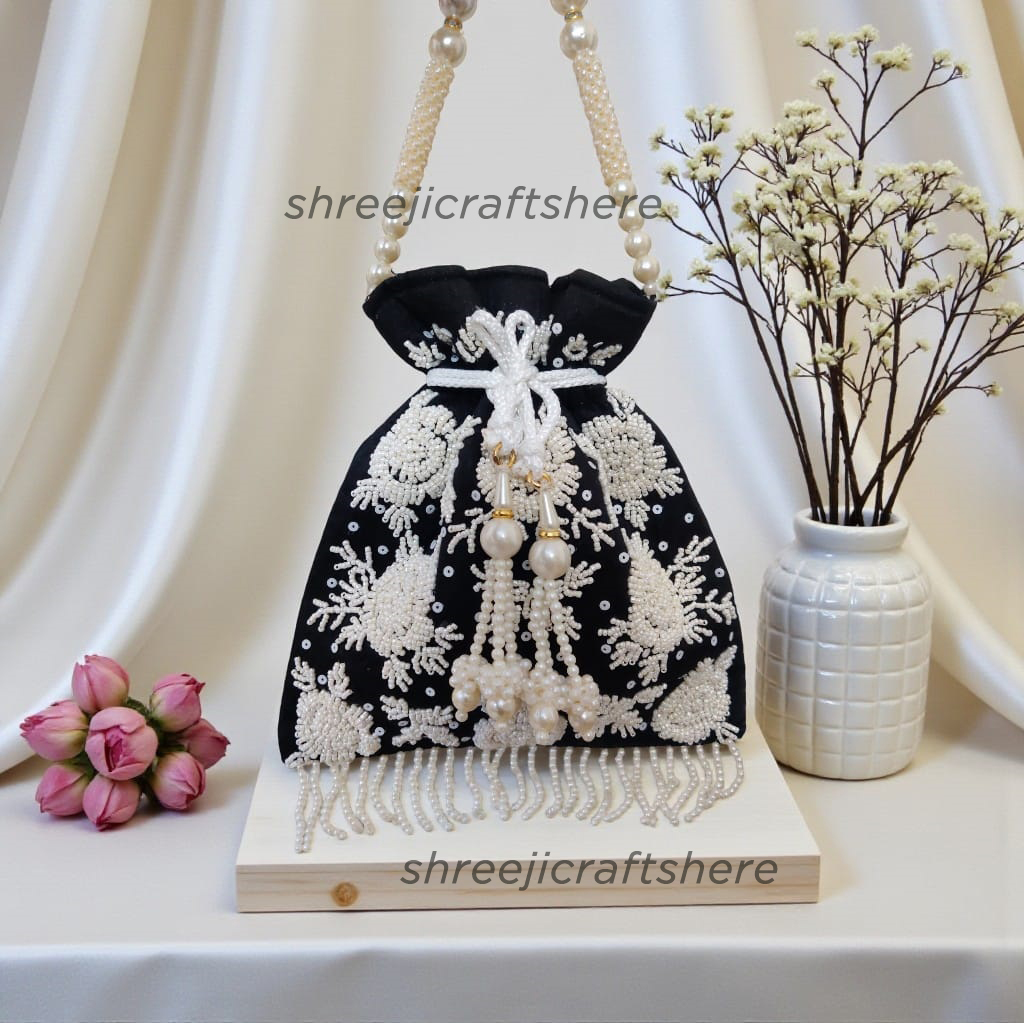 Black' Pearl Work Clutch Bag for Women | Handmade Ethnic Party Purse | Indian Bridal & Festive Clutch