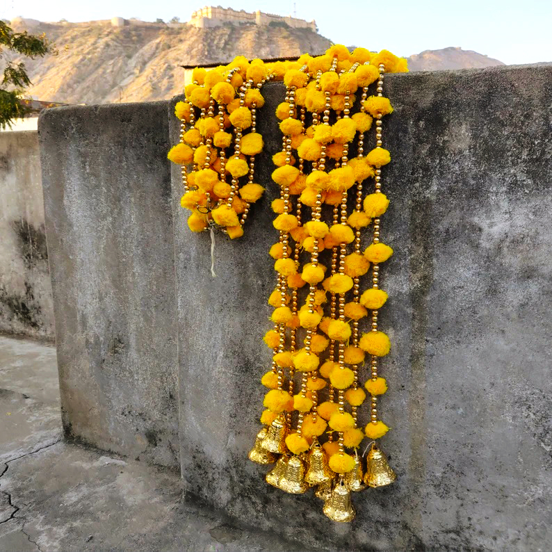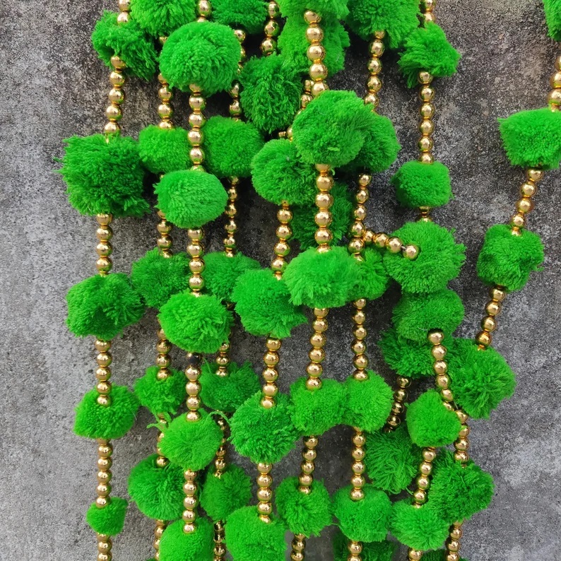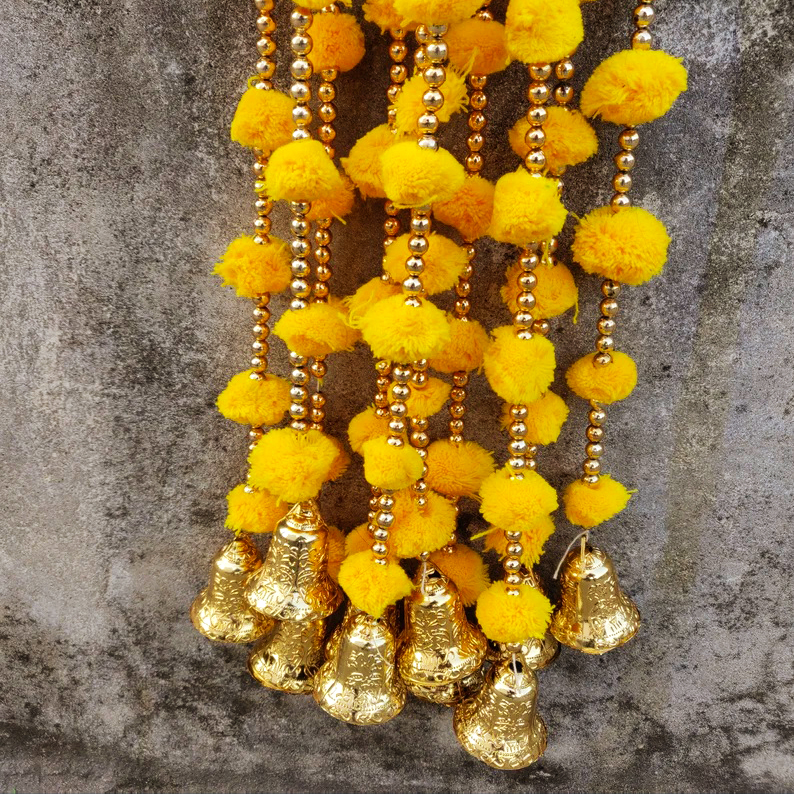 5 Feet’ Pom Pom Decoration Strings with Bells | Handmade Colorful Hanging Garland | Indian Festive Decor | Wedding & Home Decoration