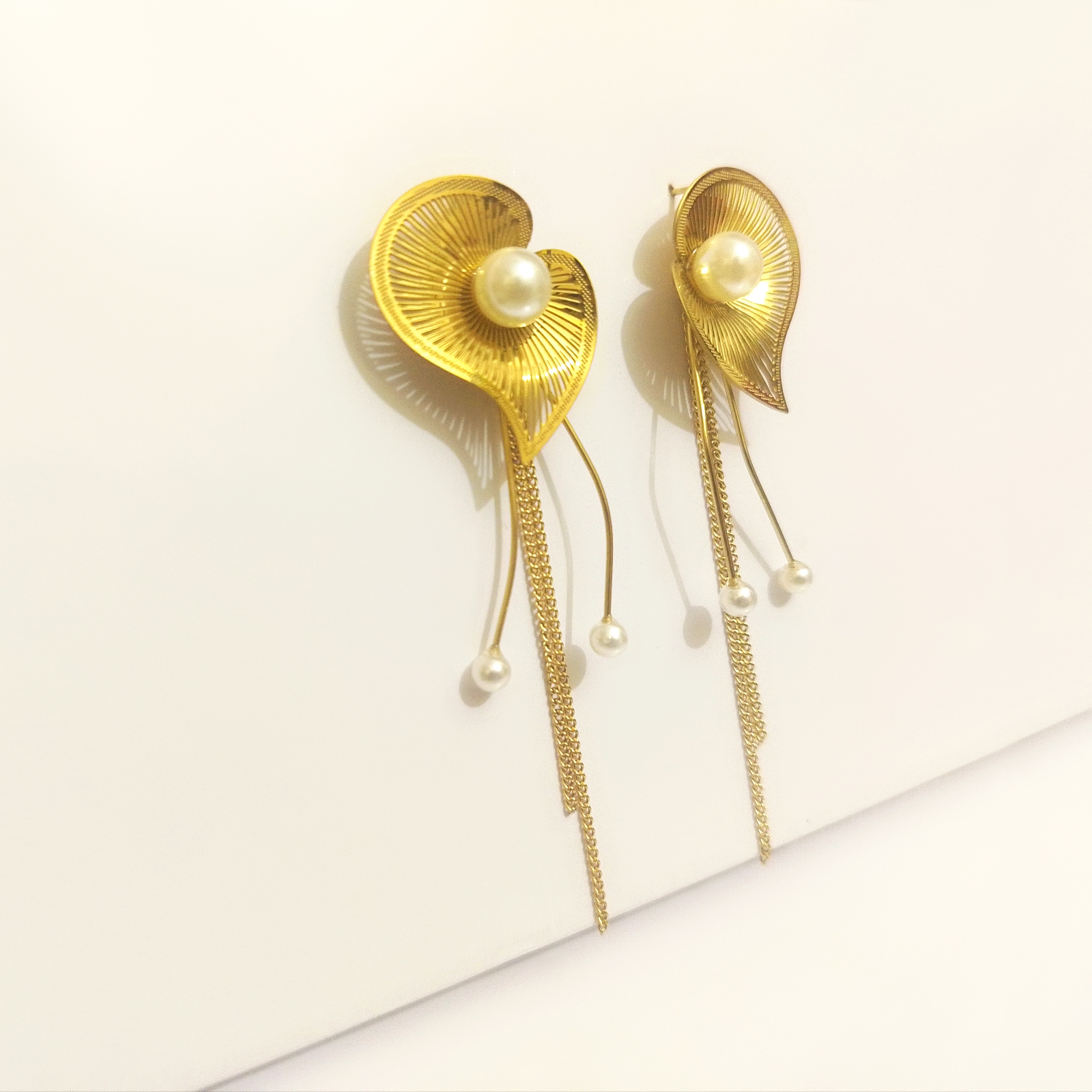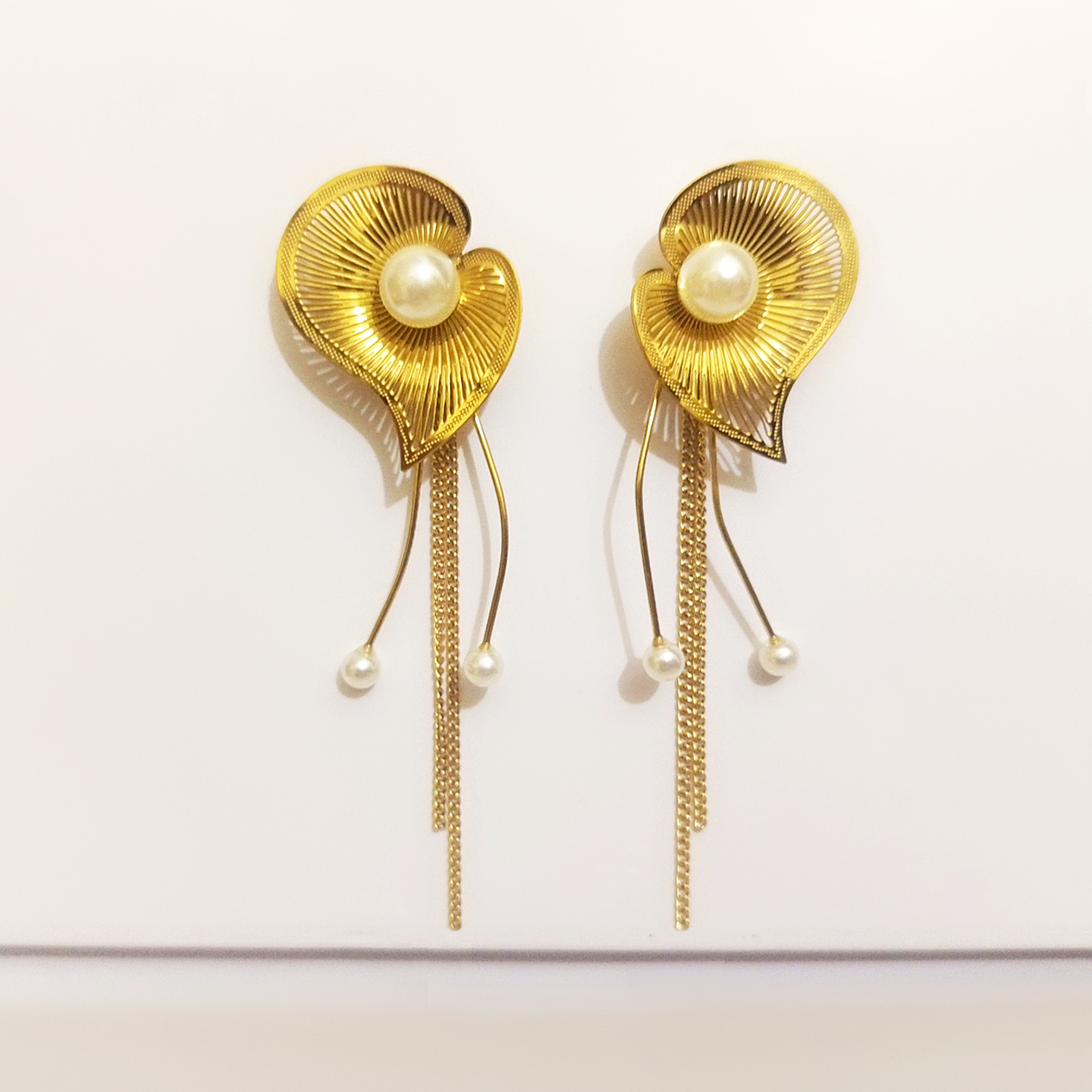 At the center of each heart sits a lustrous, creamy faux pearl, adding a touch of classic sophistication. The design is further enhanced by graceful, dangling elements: two slender gold wires tipped with petite pearls and a central, multi-strand fine gold chain tassel that creates beautiful movement as you walk.