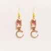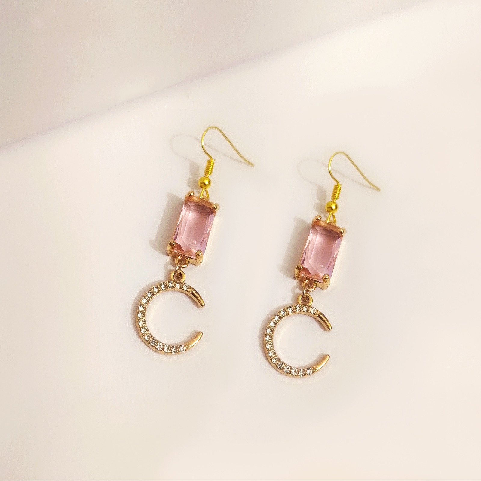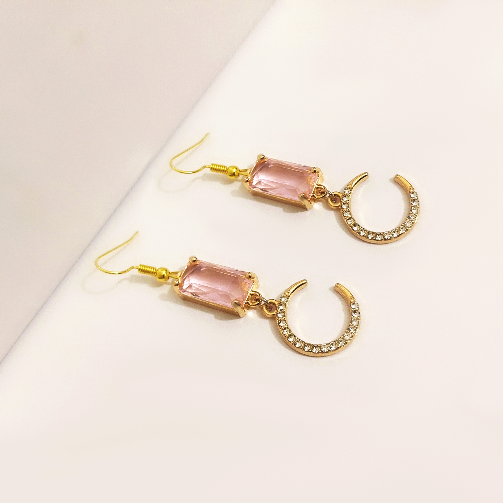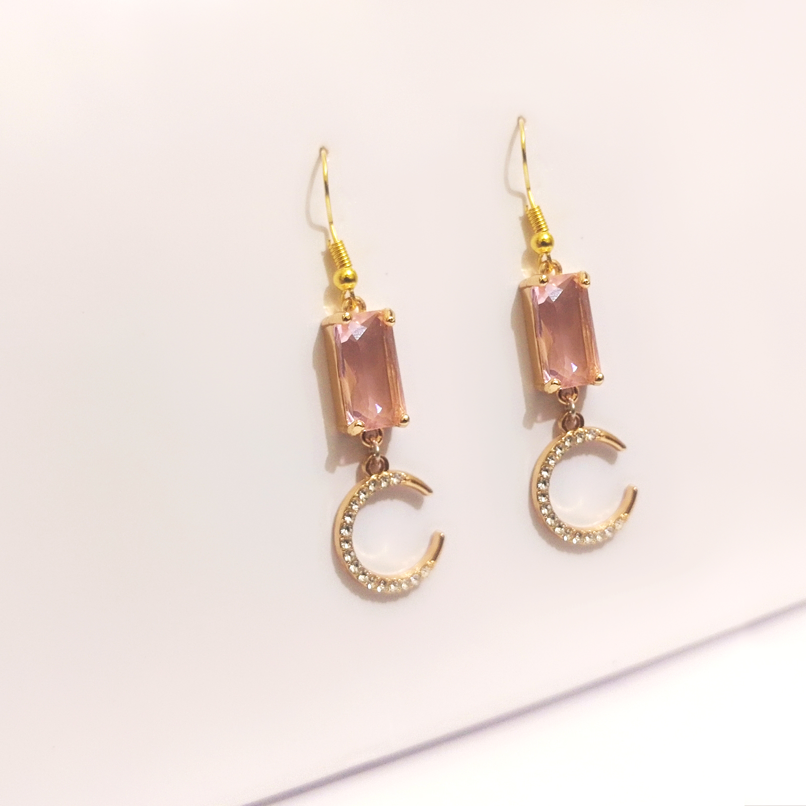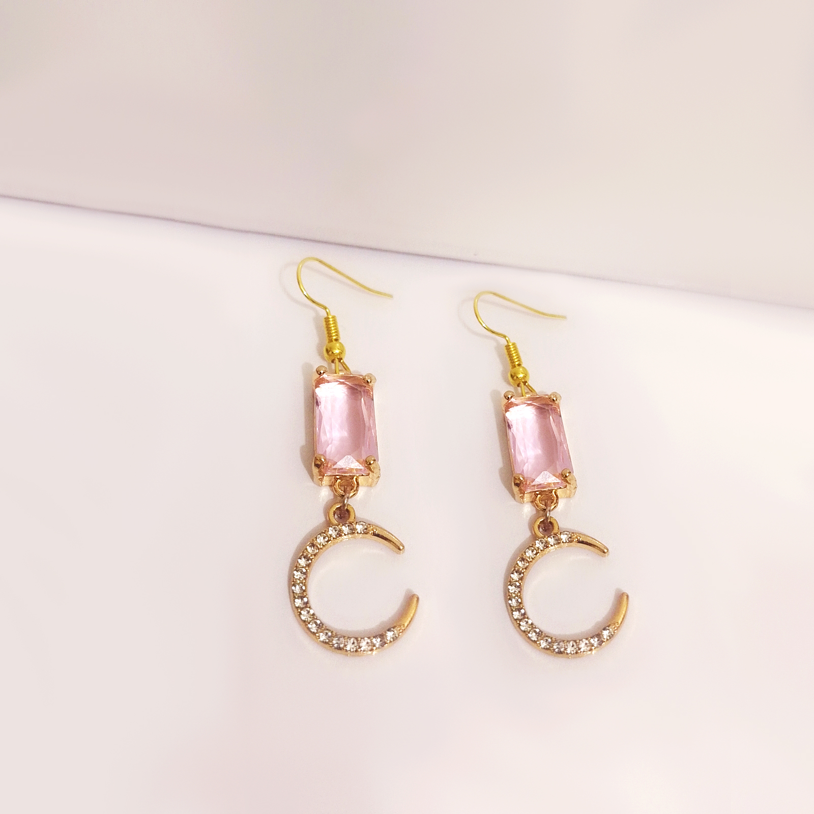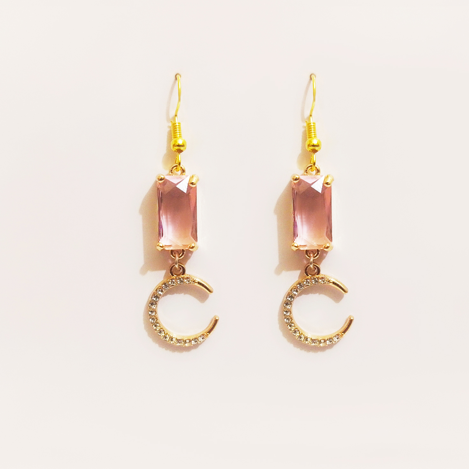 Pink Crystal & Crescent Moon Drop Earrings – Gold Tone