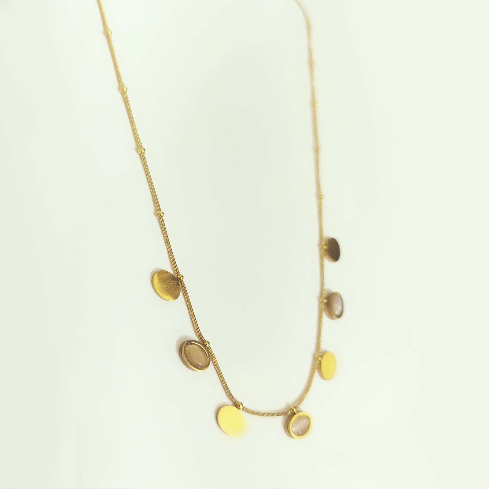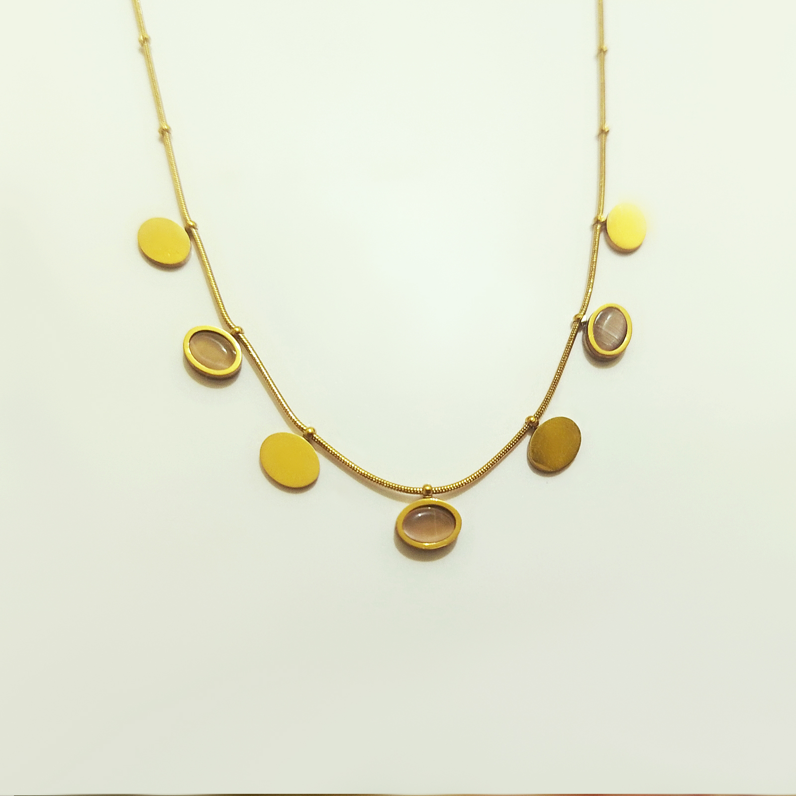 Designed with a smooth, flexible snake chain, this piece features a balanced arrangement of alternating flat gold oval discs and elegantly bezel-set stones in a soft, muted hue.