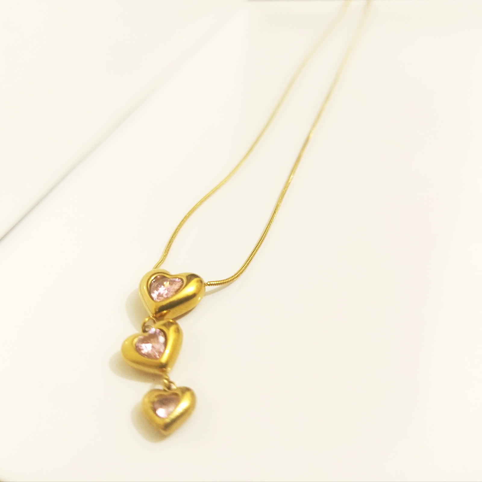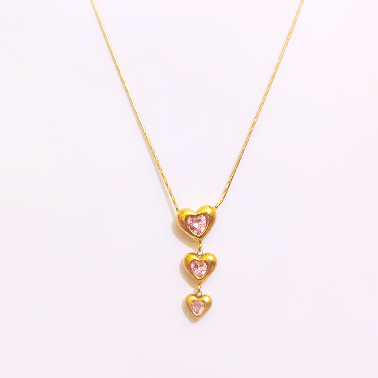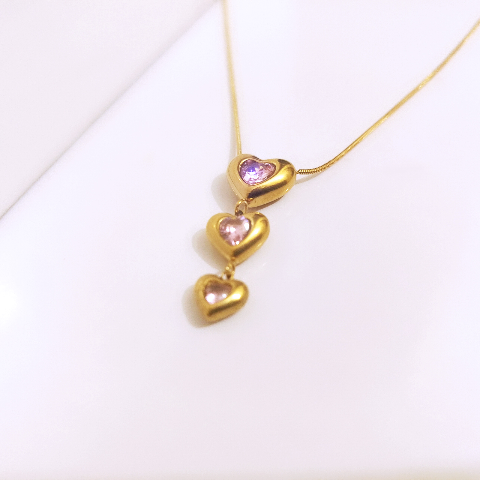 This beautiful piece features a vertical drop of three puffy, polished gold-tone hearts in elegantly graduated sizes. Each heart perfectly cradles a sparkling, faceted pink crystal at its center, catching the light with every movement. Whether you are searching for a thoughtful gift for a loved one or a feminine statement piece to elevate your everyday jewelry rotation, this dainty necklace delivers effortless charm and elegance.